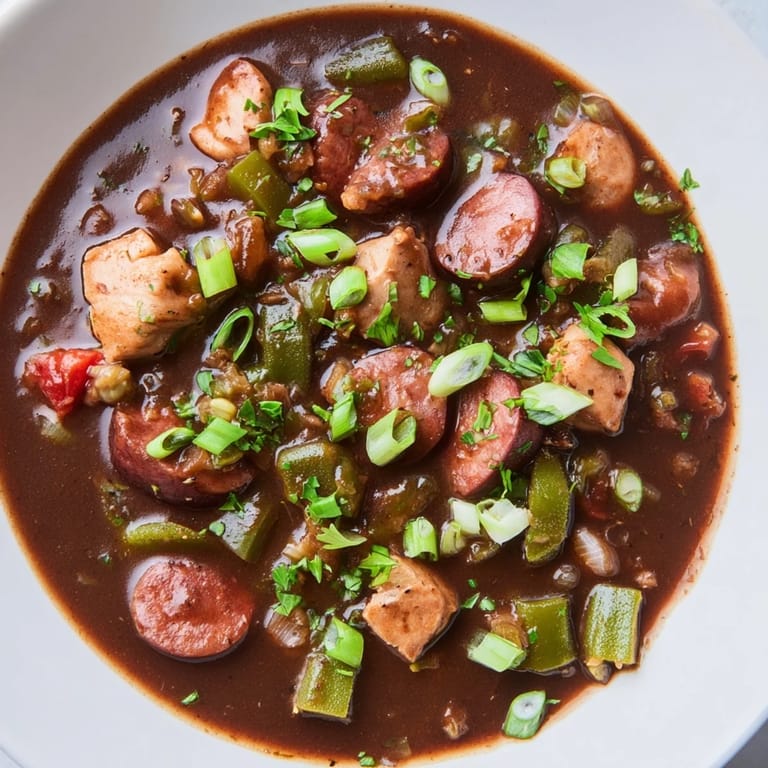 Pin It The first time I made gumbo, my kitchen filled with a smell so rich and deep that my neighbor actually knocked on the door asking if something was burning. It wasn't—it was that crucial moment when the roux finally turned the color of dark chocolate, and I realized I'd been holding my breath the entire time. That dark roux, patience incarnate in a pot, became the foundation for everything that followed: the sausage, the chicken, the okra all sinking into this velvety brown base that somehow tastes like Louisiana itself.