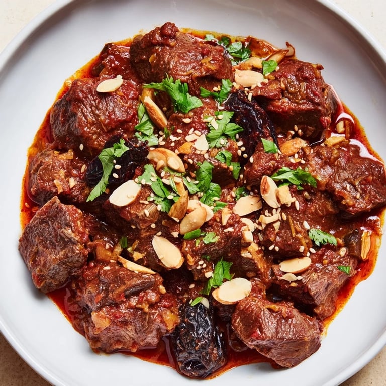 The combination of prunes and almonds might seem like an unexpected choice if you're not familiar with Moroccan cooking, but it's actually one of those perfect pairings that feels like it was always meant to be together. The prunes bring a jammy sweetness and chewy texture, while the almonds add richness and a gentle crunch that contrasts beautifully with the tender lamb. Early on, I made this recipe with dried apricots instead because I thought I was being clever, and while it was still delicious, something felt missing—the prunes have a deeper, more subtle sweetness that doesn't overpower the savory spices the way apricots can.