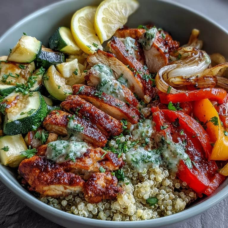 Pin It This recipe is as visually stunning as it is delicious. The combination of smoked paprika, dried oregano, and thyme creates a savory crust on the chicken that pairs beautifully with the natural sweetness of roasted bell peppers and zucchini. Whether you are cooking for family or meal-prepping for the week, this bowl is a reliable go-to for clean, flavorful eating.