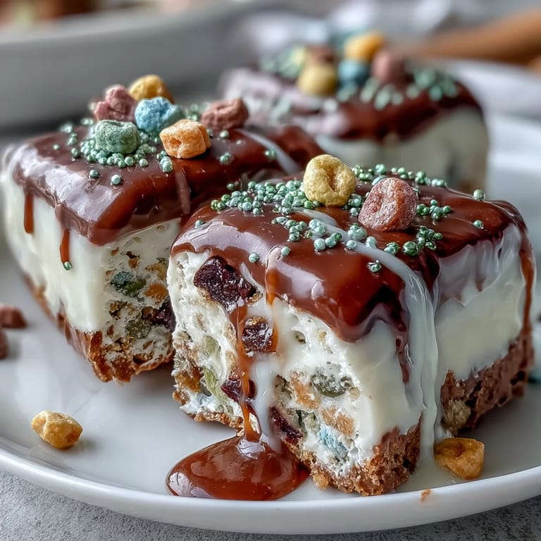 - Sprinkle the Lucky Charms cereal over the warm chocolate immediately, pressing gently so they stick without breaking. The marshmallows add pockets of sweetness and visual interest.